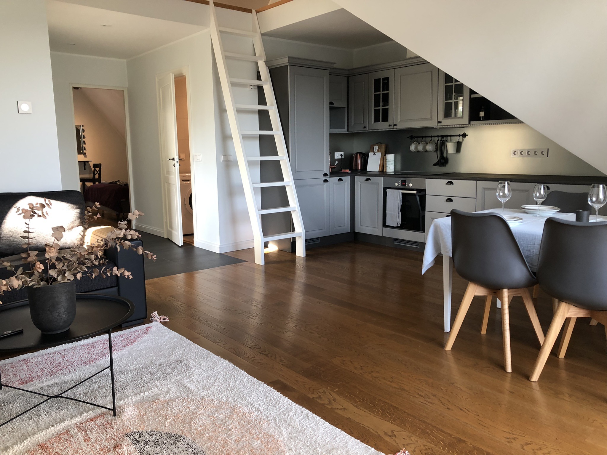 Korter asub maja teisel korrusel, päikseline rõdu avaneb maja lõunapoolsele küljele kus on mõnus nautida lummavaid vaateid aiale ja privaatselt päevitada. Korteris on konditsioneer mis võimaldab ka kuumal suvepäeval ennast mõnusalat jahutada. Korteris on täislahendusega köök, nõudepesumasina, pesumasina ja ruumika külmikuga. Moodne dušširuum koos WC-ga laseb tunda end kui luksuses. Parkimine maja kõrval kinnises hoovis tagab mugavuse ja teeb puhkamise eriti mugavaks. Võimalik kasutada ka aias asuvat privaatset istumis- ja grillinurka.